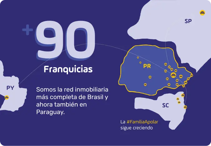 Con más de 90 franquicias distribuidas entre Brasil y Paraguay, Apolar es la red inmobiliaria más grande de la región. Nuestra amplia cobertura facilita el acceso a los mejores clientes, proporcionando más oportunidades de negocio para su inmueble y un proceso eficiente de venta y alquiler.